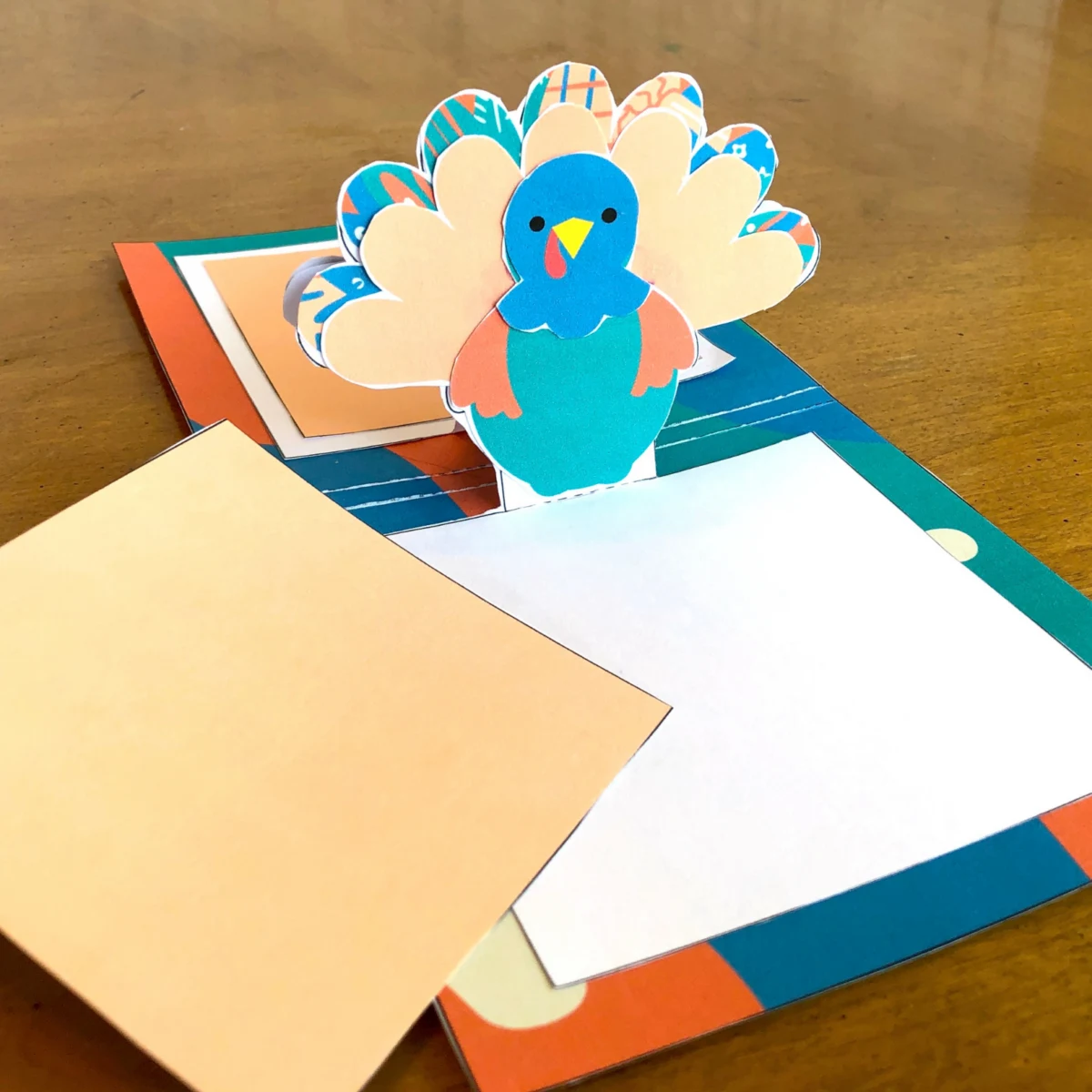 Center and glue the white square sections of the turkey outline cards to both insides of the base card. Only glue the white square down, and leave the turkey popping up.